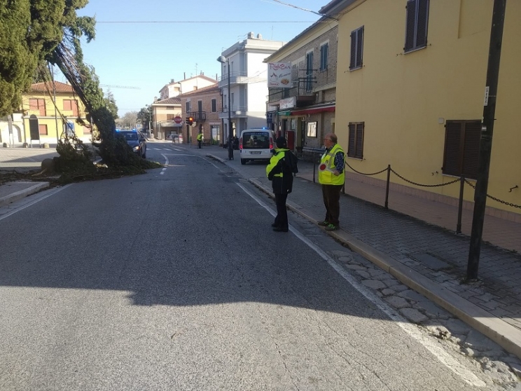 Le forti raffiche di vento che da diverse ore sferzano il maceratese hanno provocato danni anche a Chiesanuova dove un grosso ramo di pino è caduto sulla strada in via Don Luigi Sturzo proprio davanti alla scuola elementare e dell'infanzia. Fortunatamente in quel momento nessuno transitava lungo la via, con gli ultimi bambini che pochi istanti prima avevano guadagnato l'ingresso della scuola. Sul posto i vigili del fuoco per la rimozione dell'albero, la polizia locale e i volontari della Protezione civile che hanno provveduto a regolare il traffico veicolare.