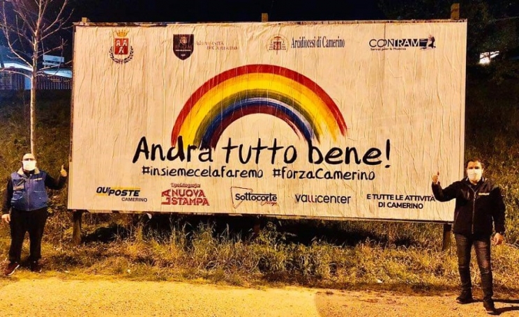 Camerino, inaugura la primavera con un messaggio di positività trasmesso alla cittadinanza. Da ieri sera, in via Andrea D'Accorso all'incrocio con via Montagnano è comparso uno striscione per dire " andrà tutto bene, insieme ce la faremo. Forza Camerino". Un modo per avvicinare tutti i camerinesi in un momento delicato in cui è necessario mantenere le distanze. Il risveglio della natura porta i sette colori dell'arcobaleno per incoraggiare al senso di responsabilità, rafforzandolo della fermezza e della pazienza di ognuno, per riuscire a superare insieme questo periodo cupo e difficile.
