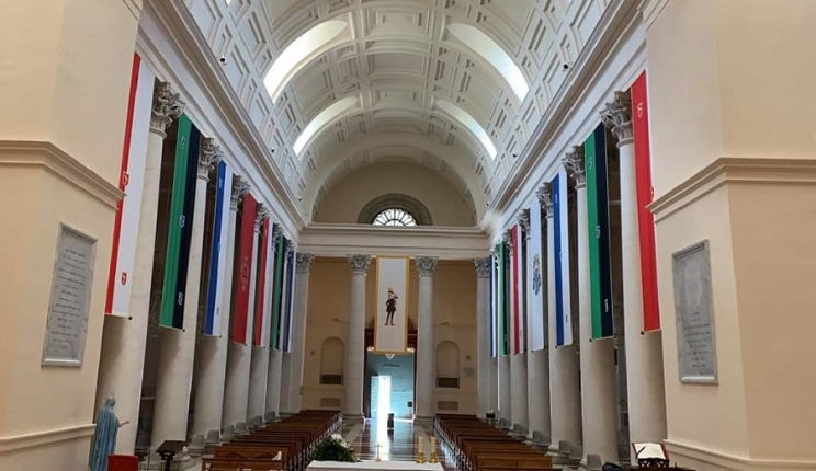 I colori dei terzieri di Muralto, Mezzo e Sossanta, hanno già riempito i lati opposti della navata centrale della chiesa, addobbata come di consueto per ospitare il suggestivo momento della preghiera di affidamento della vigilia che, data l’emergenza sanitaria del Covid -19, quest’anno dovrà svolgersi in una forma inedita, costretta dalle misure di distanziamento. Nessun Corteo storico per le vie della città, percorse per 38 anni da fiaccole e tamburi, gentili dame e nobili messeri, tutti diretti verso la basilica nel rendere omaggio al Santo, in un preludio di grande festa.