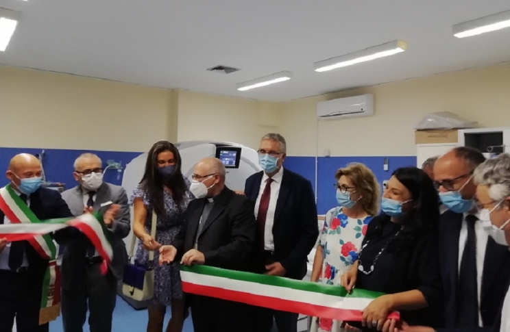 Poco dopo ci si è spostati nella sala della radiologia dove, presente il responsabile dott. Maurizio Lucarelli, è avvenuto il taglio del nastro della nuova Tac e la benedizione della strumentazione da parte dell'Arcivescovo.