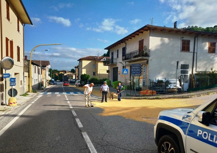 Piccoli disagi alla circolazione stradale, nel tardo pomeriggio di martedì, lungo la SS 502 “Cingolana” nel breve tratto urbano che va da incrocio per la località Sant'Elena a quella per passo Colmone, nella frazione di Cesolo di San Severino Marche. A causa del cedimento di una delle sponde laterali, un autocarro di un’azienda settempedana ha perso parte del carico che è finita sulla sede stradale. Il mezzo, che trasportava orzo, ha subito arrestato la marcia e l’autotrasportatore che ne era alla guida si è dato da fare per rimediare all’incidente che ha avuto una rapida soluzione grazie anche all’intervento di alcuni abitanti che si sono prestati per ripulire l’asfalto. Sul posto, per regolamentare la viabilità e segnalare il pericolo, è intervenuta una pattuglia della Polizia Locale.
