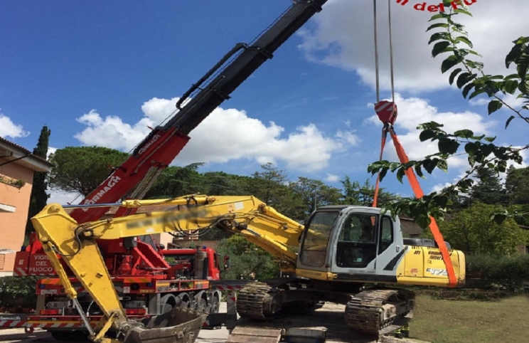 Intervento dei Vigili del Fuoco a Sforzacosta (MC) per il recupero di un escavatore. A causa di un guasto meccanico del carrellone sul quale stava per essere caricato, il mezzo si era infatti inclinato pericolosamente da un lato rischiando di cadere a terra. La squadra di Macerata arrivata in soccorso con un'autobotte, un mezzo 4x4, e con l'ausilio dell'autogrù, è riuscita a recuperare l'escavatore riportandolo nella giusta posizione sopra il carrellone. Nessuna conseguenza per le persone.