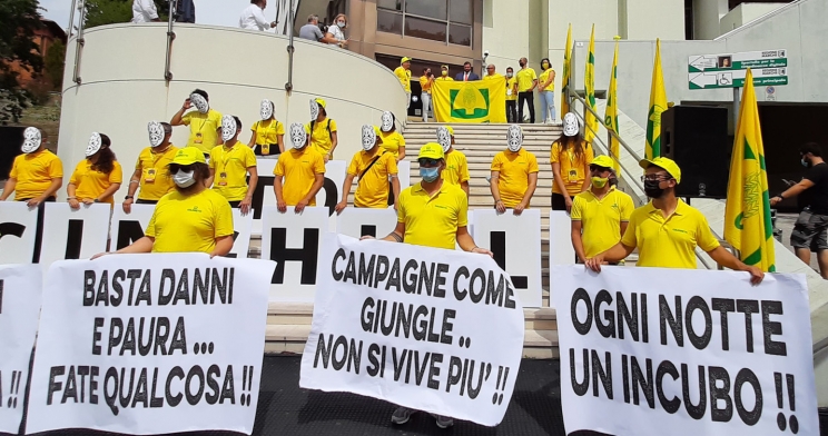 Un flashmob davanti alla sede della Regione Marche ad Ancona. Così gli agricoltori hanno protestato per il massiccio aumento della popolazione di cinghiali nel corso della pandemia. Nei mesi di chiusura pressoché totale quando, a causa delle restrizioni, non sono state effettuate le campagne di contenimento, la crescita del numero di esemplari è stata esponenziale.