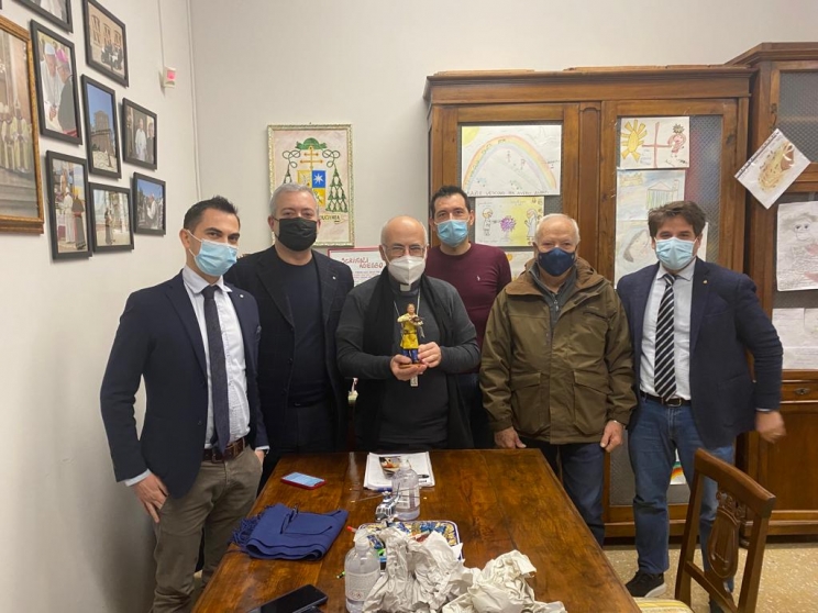 È l’imprenditore il personaggio 2021 del presepe secondo Coldiretti, Confartigianato e Fondazione Symbola. E proprio una statuina artistica realizzata dagli artigiani della tradizione è stata consegnata questa mattina all'arcivescovo Francesco Massara, da Giordano Nasini, direttore di Coldiretti Macerata, dal vicepresidente di Coldiretti Macerata Antonio Fainelli con il segretario generale di Symbola Fabio Renzi, Renzo Leonori e Riccardo Golota, rispettivamente membro di giunta e funzionario di Confartigianato Macerata-Ascoli-Fermo.