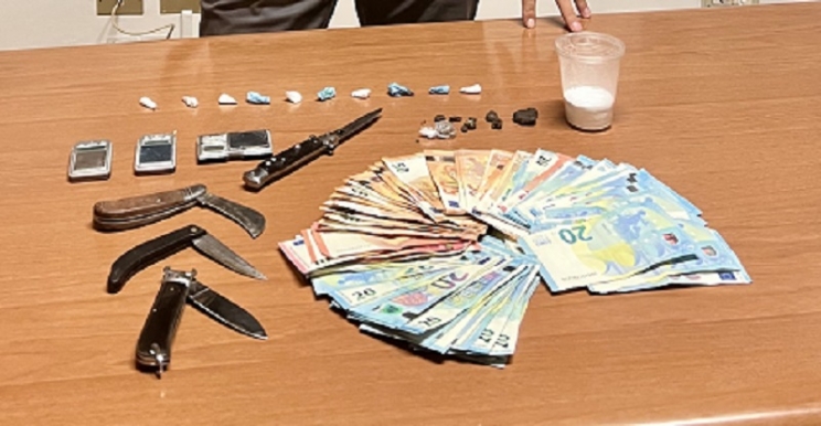 Gli agenti hanno così proceduto ad identificare il cedente che, all’esito della perquisizione, è stato trovato in possesso di altre 9 dosi di cocaina e di 2.630 euro in banconote di diverso taglio; le ricerche poi condotte presso l’abitazione del responsabile, sita nel comune di Corridonia, hanno invece portato al rinvenimento di 8,8 grammi di hashish, di 53,70 grammi di sostanza da taglio, nonché di un coltello a molla illegalmente detenuto.