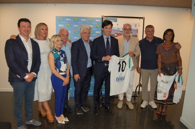 Anche il presidente della Regione, Francesco Acquaroli ha portato il suo saluto agli organizzatori della manifestazione che hanno voluto omaggiarlo donando la maglia “ numero 10” della squadra dei Cuori Sibillini.