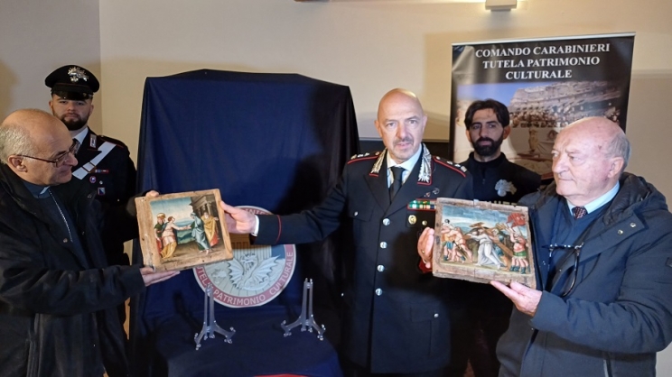 A condurre le indagini che hanno portato al recupero delle due preziose opere è stato il Nucleo per la tutela del patrimonio culturale dei Carabinieri di Bologna, guidato dal tenente colonnello Giuseppe De Gori. Il comandante De Gori ha simbolicamente restituito in prima persona le due tavolette all’Arcivescovo di Camerino-San Severino Marche, Francesco Massara. Presenti per l’occasione, oltre ai militari del Nucleo Tpc di Bologna, anche il comandante provinciale dell’arma, Nicola Candido, il comandante dei carabinieri di Tolentino, Giulia Maggi, il sindaco di Fiastra, Sauro Scaficchia, lo storico dell’arte Matteo Mazzalupi e la direttrice del Marec, Barbara Mastrocola.