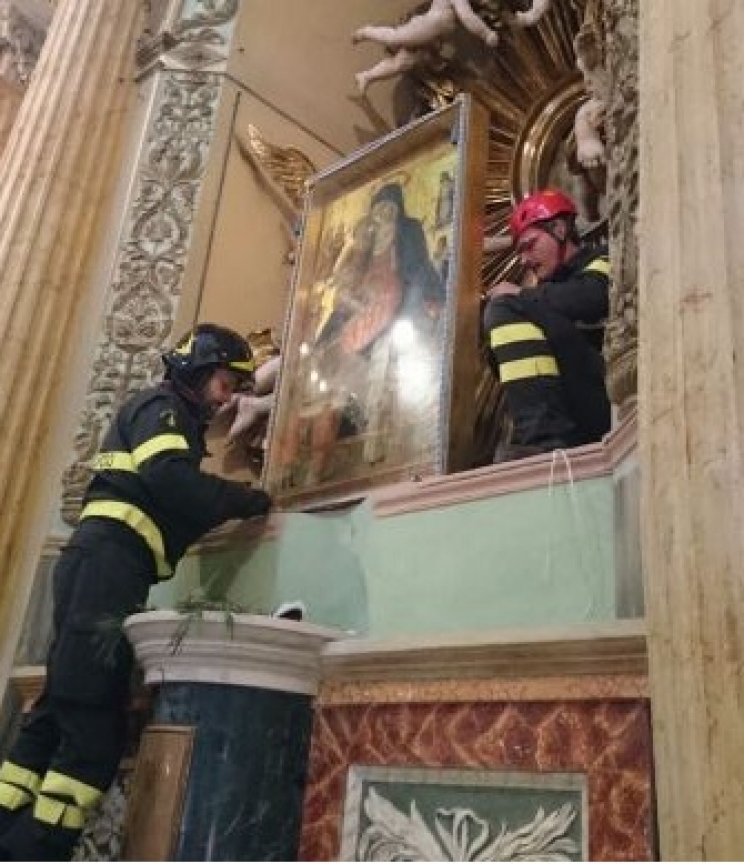 Non sarà una Pasqua come tutte le altre quella che si appresta a vivere la comunità di Caldarola, costretta, come noto, a fare i conti con i danni del terremoto, con l'intero centro storico, ancora zona rossa, chiuso dal 30 ottobre. La tradizionale processione del Lunedì dell'Angelo, giorno di festa più importante dell'anno per i caldarolesi, residenti e non, che da sempre si riunivano intorno alla venerata immagine della Vergine, non vedrà infatti il quadro originale della Madonna del Monte percorrere le vie del paese. La tela dipinta nel 1491 da Lorenzo D'Alessandro, su commissione del beato Francesco Piani, da sempre custodita nell'omonimo santuario nella piazza principale del paese dei cardinali Pallotta è stata, infatti, prelevata dalla sua sede per essere trasferita a San Severino, nel deposito dove si trovano custodite molte opere recuperate da chiese della diocesi di Camerino – San Severino ferite dal sisma. La decisione, fa sapere il parroco, si è resa necessaria per la realizzazione dei lavori all'interno del tempio visto l'aggravamento delle condizioni dell'edificio che, ora, necessita anche di una messa in sicurezza all'interno. Viene, così, a confermarsi il tradizionale detto caldarolese "Se non esce il Figlio non esce neppure la Madre", ad indicare nel corso degli anni che qualora non si fosse svolta la processione del Venerdì Santo (per cause metereologiche) non si sarebbe celebrata neppure quella del Lunedì di Pasqua.
