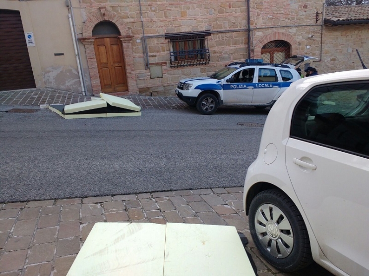 A Camerino le forti raffiche hanno provocato la caduta di alcuni pannelli isolanti di copertura dei tetti di edifici in parte lesionati dal terremoto in via Madonna delle Carceri.