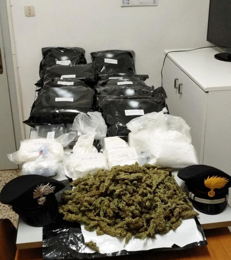 Scoperti dai carabinieri due garage condominiali utilizzati come deposito e laboratorio per il confezionamento di dosi di marijuana e cocaina a Montecosaro. I militari hanno sequestrato circa 10 kg di marijuana e 5 kg di cocaina. Durante un servizio antidroga, i militari di Montecosaro e quelli della Compagnia di Civitanova Marche hanno controllato un 28enne di origine albanese, da poco domiciliato nella zona, mentre guidava una Y10. Dentro la giacca aveva un involucro con 6 grammi di marijuana. Inizialmente la perquisizione domiciliare ha dato esito negativo, ma poi i militari hanno rinvenuto le chiavi di due garage condominiali. Nel primo c'era un borsone contenente 9 pacchi sigillati di marijuana per un peso complessivo di 9,07 kg e e 6 panetti di cocaina per 4,638 kg. Nel secondo garage c'erano, un altro kg di marijuana, altri 400 gr di cocaina, 4 kg di sostanze da taglio, due bilance, un essiccatore e un cromatografo. Il 28enne si trova ora nel carcere di Montacuto ad Ancona.