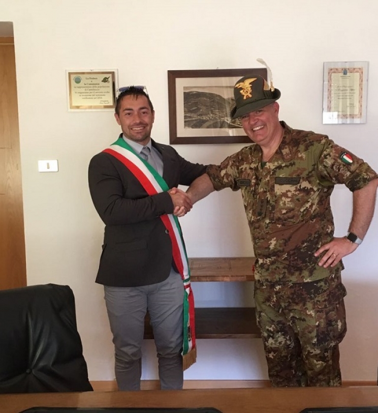 Il Comune di Pieve Torina, ospite della festa di corpo del 5° reggimento degli alpini di Vipiteno. Lo scorso 5 giugno, a dimostrazione del forte legame nato con la popolazione già dalle primissime ore post sisma, il sindaco Alessandro Gentilucci ha preso parte all’annuale festa tenutasi presso la caserma di Vipiteno. Il 5° Alpini, uno dei primi Reparti dell’Esercito ad essere intervenuto nelle aree martoriate e, giusto un anno fa, dopo mesi di vigilanza e protezione del paese, al momento di lasciare la comunità per l’avvicendamento, il comandante colonnello Cucchini aveva voluto conferire al sindaco Gentilucci una pergamena e una medaglia, in segno di amicizia, incoraggiamento e speranza.