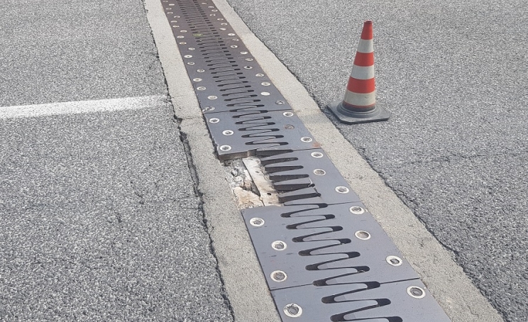 Un'auto che percorre la supestrada 77 Valdichienti in una tranquilla mattina di metà settembre quando, dietro l'angolo, ecco l'imponderabile. Un forte botto e la macchina costretta a fermarsi per il danno. Ecco quanto avvenuto sulla suddetta arteria all'altezza del ponte Fiungo 2, tra le frazioni di Campolarzo e Sfercia nel territorio di Camerino, dove improvvisamente è saltata la piastra d'acciaio (nella foto) di un giunto che ha colpito la vettura. L'autobilista, fermo in superstrada, è stato subito soccorso da una pattuglia dei carabinieri in transito, con i militari che hanno allertato la polizia stradale. Gli agenti hanno provveduto a chiusura la corsia di marcia interessata, avvertendo nello stesso tempo l'Anas che ha subito disposto un sopralluogo sul ponte. Superstrada, dunque, ridotta ad una corsia, in direzione Foligno, per permettere la messa in sicurezza, ma nessun problema per la struttura del viadotto, visto che detti giunti sono necessari per la dilatazione termica, onde impedire che la soletta posta sopra le travi venga ulteriormente sollecitata. I medesimi lavori di manutenzione sono in corso anche sul ponte di Caldarola, che lo scorso mese di agosto era stato interessato da lavori di verifica e manutenzione dopo il terremoto che nel 2016 ha sconvolto l'alto maceratese. Dunque controlli puntuali e pronti interventi, in caso di necessità, su ponti e viadotti lungo la superstrada 77, sicuramente una delle arterie viarie maggiormente controllata.