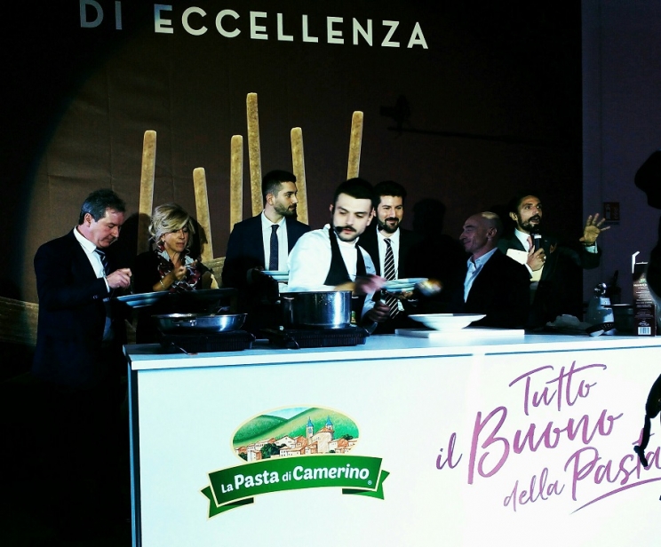 Venerdì, 05 Ottobre 2018 22:13 | Letto 7396 volte   Clicca per ascolare il testo Presentata "Hammurabi" la nuova pasta da grano antico d'eccellenza Evento di presentazione per Hammurabi il nuovissimo prodotto a marchio La Pasta di Camerino, ultima creatura dellazienda Maccari di Torre del Parco, titolari di Entroterra S.P.A. La data scelta per la presentazione  non è stata casuale, ricorrendo il compleanno di Miriam, ultima arrivata a rallegrare  la bellissima famiglia  composta da papà Gaetano, mamma Mara e i fratelli Federico e Lorenzo già pienamente e  professionalmente inseriti nellorganico. Centinaia le persone intervenute per loccasione nella sede dellazienda di Camerino, insieme a numerose autorità e a tutto lo staff di dipendenti e fornitori. Alla presentazione della nuova pasta di semola, hanno partecipato il sindaco Gianluca Pasqui, lassessore regionale Angelo Sciapichetti, lonorevole della Lega Tullio Patassini membro delle attività produttive della Camera dei deputati, il rettore di Unicam Claudio Pettinari, larcivescovo Francesco Brugnaro, il campione olimpico Jury Chechi, ricercatori ed esperti di scienze dellalimentazione e il vincitore di Masterchef Simone Scipioni che si è esibito in un cooking show a base di Hammurabi, condita con linedita ricetta del sugo di Camerino di sua creazione.    Terzo attore a livello nazionale nel settore della pasta secca alluovo, La pasta di Camerino chiuderà il 2018 con 18 milioni di fatturato. Grazie ad un lavoro congiunto tra Isea e Università di Camerino, si è riusciti a recuperare un grano antico di eccellenza, utilizzato per produrre la nuova nata Hammurabi.  La pasta è infatti realizzata con grano monococco macinato a pietra  dalle caratteristiche organolettiche straordinarie e dall alto contenuto di ferro, fosforo,magnesio e fibre, per un prodotto davvero unico nel mondo della pasta. Intera tracciabilità della filiera, materie prime  100% made in Italy, triplo impasto lento, trafilatura a bronzo ed essicazione a bassa temperatura sono un vanto dellazienda Entroterra S.P.A, applicato a tutto il catalogo di prodotti che, insieme ad Hammurabi, vanno dalla pasta alluovo a quelle di semola e di farro. Fondata nel 2002 da Gaetano Maccari lazienda familiare Entroterra ha saputo reagire con determinazione ai disagi del terremoto 2016, addirittura ampliando lo stabilimento, assumendo altri 20 dipendenti e continuando a crescere e innovare. Per ogni nostro prodotto noi puntiamo proprio su questo - ha spiegato Federico Maccari, amministratore delegato di Entroterra S.P.A.-; tutto il nostro sistema prodotti è di filiera 100 % italiana con la garanzia di trasparenza per il consumatore data dal fatto che per ogni lotto di pasta da noi prodotto si può risalire a tutto il proceso di filiera. Anche questo nuovo grano dal nome straniero  è coltivato tutto in Italia. E un antico grano di eccellenza che abbiamo voluto chiamare Hammurabi proprio per il suo legame storico, risalendo i suoi primi rilievi all11.000 a,C. Un prodotto dalle straordinarie caratteristiche nutritive, a basso contenuto di glutine, con il 20 % di proteine, elevato contenuto di minerali utili al benessere e su cui tentiamo di far sviluppare questo territorio. E un prodotto esclusivo che rompe tutti gli schemi conosciuti oggi nel mondo della pasta e ci auguriamo che possa ottenere il successo che merita, perchè è un prodotto davvero buono, e ci permetta di dare anche spazio e occupazione a questo territorio. La pasta Hammurabi sarà in distribuzione tra un mese circa e , come preannunciato da Federico Maccari, il prossimo anno lazienda metterà in commercio anche farine di grano Hammurabi, specifiche per ogni preparazione casalinga, come pane, biscotti, pizza. Crediamo  che il consumatore possa ben accogliere questi nuovi prodotti perchè hanno un forte richiamo salutistico che è poi quello che oggi si cerca sempre di più. Sono davvero felice di questo bel pomeriggio caloroso che ci ha dato modo di presentare il nostro nuovo prodotto; tanti gli ospiti che hanno apprezzato il nostro progetto e che siamo convinti porterà un buon risultato; ci fa piacere sapere che essi stessi, potranno essere da passaparola per questa novità.  C.C.  Simone Scipioni ai fornelli Nella foto Jury Chechi