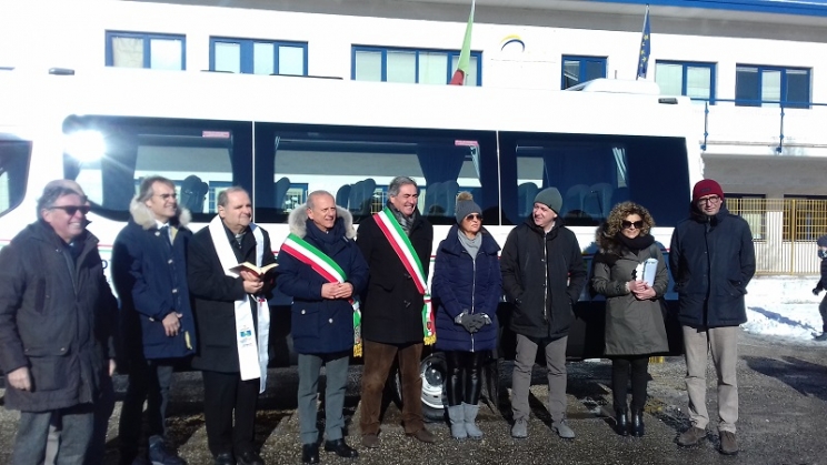 In attesa dell'inaugurazione della nuova scuola, prevista per il prossimo 2 febbraio, Caldarola si arricchisce di "un nuovo tassello verso il lento ritorno alla normalità", secondo le parole del sindaco Luca Giuseppetti. E' stato inaugurato, con tanto di taglio del nastro e di benedizione del parroco, il nuovo minibus a servizio non soltanto del trasporto scolastico, ma anche delle esigenze dell'intera comunità. Un progetto realizzato dall'amministrazione comunale grazie alla solidarietà di tante associazioni vicine, fin dal giorno del sisma, ai cittadini di Caldarola, in modo particolare ai più giovani. "Mi piace ricordare - conclude il primo cittadino - come grazie al cuore e alla generosità di tanti abbiamo realizzato un ulteriore progetto per i nostri giovani, futuro della nostra comunità".