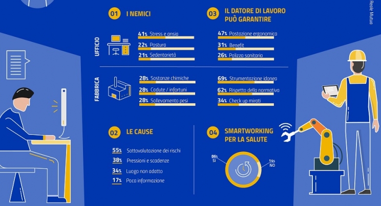 L'attività lavorativa, infatti, può condizionare in vario grado la salute dei lavoratori. In ufficio, il principale fattore di rischio, a detta di quasi un abitante delle Marche su due (41%), è lo stress, con tutti i suoi possibili effetti sul benessere fisico e mentale. Seguono la postura (22%) e la sedentarietà (21%), mentre il 10% si dice preoccupato dalle possibili conseguenze sulla vistaIn un ambiente quale la fabbrica, o comunque per chi svolge un'attività più fisica, invece, il fattore che incide maggiormente sulla salute è il contatto, o esposizione, a sostanze chimiche potenzialmente nocive (28%), seguito dall'eventualità di cadute e infortuni (28%) e per una quota analoga dai pericoli connessi al sollevamento di pesi e alla movimentazione di carichi. Ma che cosa porta ad “ammalarsi” di lavoro? Per oltre un marchigiano su due (55%), la prima causa è la sottovalutazione dei rischi, seguita dalle pressioni e scadenze lavorative che possono indurre a comportamenti impropri e pericolosi (38%) e dall'inadeguatezza dell'ambiente di lavoro (34%). Per un ulteriore 17%, invece, la ragione risiede nella scarsa informazione in materia di sicurezza e salute fornita dal datore. L'azienda stessa, tuttavia, può fare la sua parte e prendersi cura della salute e del benessere dei dipendenti. I marchigiani hanno le hanno le idee chiare: in ufficio, i principali desiderata sono postazioni ergonomiche (47%), la possibilità di usufruire di abbonamenti a palestre e centri fitness (31%), una polizza sanitaria (26%) e incontri con uno psicologo del lavoro (22%). In fabbrica, invece, il datore, secondo gli intervistati, deve fornire strumenti e dispositivi di lavoro idonei ai dipendenti (69%), garantire il rispetto delle normative (62%) e mettere a disposizione check up mirati per il controllo e la prevenzione di possibili patologie (34%). “Questa nuova ricerca del nostro Osservatorio sul welfare, giunto alla terza edizione, - commenta Michele Quaglia, Direttore Commerciale e Brand di Gruppo - ha delineato un quadro preciso delle percezioni e delle preoccupazioni degli italiani sui fattori e i modi in cui l'attività lavorativa può condizionare la salute individuale. Una risposta efficace a questi temi e a questi bisogni arriva dal welfare, in cui Reale Mutua ha una grande esperienza. Da sempre mettiamo a disposizione sia dei singoli sia delle imprese per i loro dipendenti numerose soluzioni per la tutela della salute e del benessere, come prestazioni mediche, visite e check up clinici, anche a scopo preventivo, e un'ampia gamma di benefit per la cura del wellness e la soddisfazione dei lavoratori.”