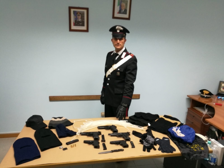 L’attenta ricerca ha quindi permesso il rinvenimento di 4 pistole semiautomatiche a salve prive di tappo rosso, cal. 8 e 9, i relativi caricatori, 20 cartucce a salve, 1 coltello di 24 cm., 2 passamontagna, 6 scaldacollo, oltre a guanti, berretti, e 50 fascette da elettricista analoghe a quelle utilizzate dagli autori per immobilizzare gli impiegati della ditta.