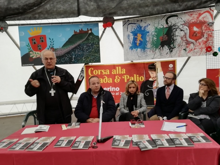 La spada, appannaggio del primo arrivato della Corsa degli atleti, donata dal Panificio Fronzi di Pieve Torina, è stata realizzata dall'artigiano del ferro Stefano Bellesi che ha forgiato anche lo spadino che andrà invece alle vincitrici della staffetta Rosa; offerto da Giusy e Lanfranco, cita gli strumenti di lavoro dei due stimati parrucchieri camerti. Accolta con entusiasmo e fragorosi applausi, la presentazione delle squadre di atlete e atleti che da mesi si stanno allenando. Molti degli spettacoli pomeridiani si svolgeranno al Sottocorte Village, nuova piazza di Camerino: " Vogliamo rivivere quel clima per ritrovarci sulle nostre strade-ha concluso Sandra Gentili, augurandosi che tutto vada per il meglio. Alla sua prima festa del patrono e rievocazione storica, Mons.Francesco Massara ha espresso l'auspicio che tutti i bellissimi momenti di festa possano essere intensamente vissuti, soprattutto, come situazioni d'incontro " L'augurio è che possa essere un momento di grande gioia in cui la città di Camerino, incontri davvero il meglio di se stessa". Un ringraziamento a tutta la macchina organizzativa e un saluto caloroso agli atleti, da parte del sindaco Pasqui, evidenziando la forza e il ruolo dei giovani nel costruire un futuro che viene dalle radici che queste terre hanno sempre espresso. " E' festa di una comunità, festa di tutti noi che non ci siamo mai stancati di esserci e crederci". Al termine della presentazione sono state premiate le ragazze il cui disegno è stato selezionato per fare da copertina al libretto: Anita Catalano, Sara Farhat, Alice Gasparroni, Anastasia Nicole Paganelli e Greta Sorella, della classe 2.a B della scuola Boccati di Camerino.