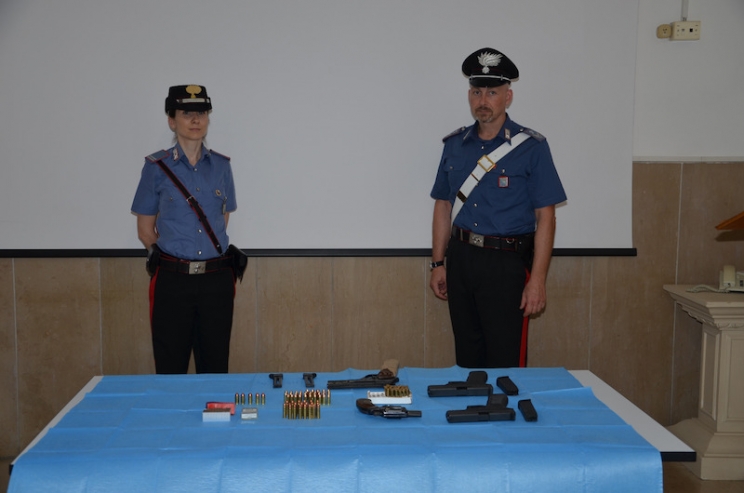 Erano state rubate lo scorso dicembre da un appartamento a San Severino. I carabinieri del Reparto Operativo di Macerata, comandati dal tenente colonnello Walter Fava, insieme ai militari delle stazioni di San Severino e Fiuminata le hanno ritrovate in aperta campagna a Falerone, in provincia di Fermo. L'attività investigativa è nata a seguito di furti in abitazione avvenuti nell’alto maceratese, condotta dal Sostituto Procuratore della Repubblica Enrico Riccioni. I militari hanno effettuato un’ispezione in aperta campagna, a Falerone, su disposizione del Procuratore della Repubblica di Macerata Giovanni Giorgio, rinvenendo, ben sotterrate, due pistole Glock calibro 40 e 45, una Beretta calibro 22, una revolver calibro 38 special e 162 cartucce per le varie pistole.