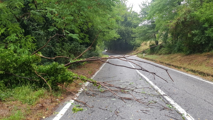 Danni anche sulle strade: lungo la SR 502 che conduce da Camporotondo a Caldarola una pianta è caduta sulla carreggiata a causa del vento.