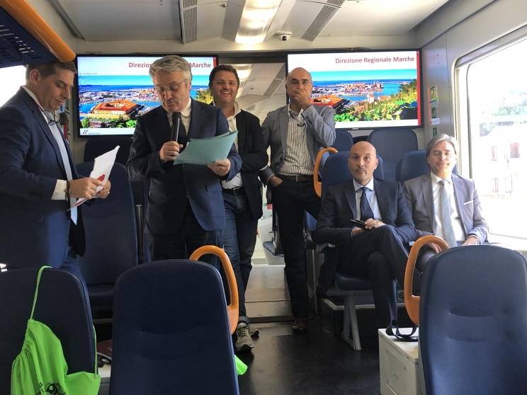 Portati a termine i primi lavori propedeutici all’elettrificazione della linea ferroviaria che collega Civitanova ad Albacina. Oggi sono stati presentati a bordo di un treno Swing dedicato, dall’assessore regionale Angelo Sciapichetti, dal direttore di Trenitalia Fausto Del Rosso, dal direttore commerciale di Rete Ferrovie Italiane Roberto Laghezza e dal sindaco di Tolentino Giuseppe Pezzanesi e il direttore di Unimc Mauro Giustozzi. Con l’occasione è stato fatto un quadro generale di sintesi delle attività della trasporto pubblico locale con un particolare focus di Trenitalia Marche e di RFI con il bilancio dei lavori propedeutici all’elettrificazione della linea.