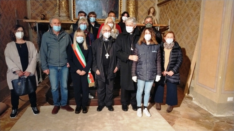Fu durante i lavori di ristrutturazione della chiesa, dopo il terremoto del 1997, che Giampiero Calcaterra, architetto di Tolentino, venne a conoscenza dell’opera. La cornice originale era ancora a San Severino, mentre la tela era finita a Osnago, nel milanese. In molti hanno lavorato a questo ritorno, che oggi è diventato realtà. Un percorso voluto dal Comune, insieme all’Arcidiocesi, alla Soprintendenza delle Marche e alla Pinacoteca di Brera che si chiude dopo quasi 25 anni.
