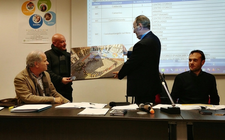 A Camerino, in occasione dell'incontro del sindaco con la città, il fotografo Roberto Conti ha donato al primo cittadino  Gianluca Pasqui, una tela con la stampa di una immagine scattata durante il progetto “Un cuore per Camerino”. A novembre 2017,  in tantissimi si erano trovati per il flash mob in Piazza Cavour, iniziativa  che ha permesso di scattare suggestive foto dall'alto: dal centro della città ferita, aveva  preso vita un grande cuore, a dimostrazione della tenacia, dell'amore e del legame profondo delle persone nei confronti della città ducale. Un omaggio che il fotografo Roberto Conti ha voluto fare, tramite l'amministrazione, a tutta la città, anche con l'intento di ringraziare quanti hanno reso possibile la riuscitissima iniziativa.