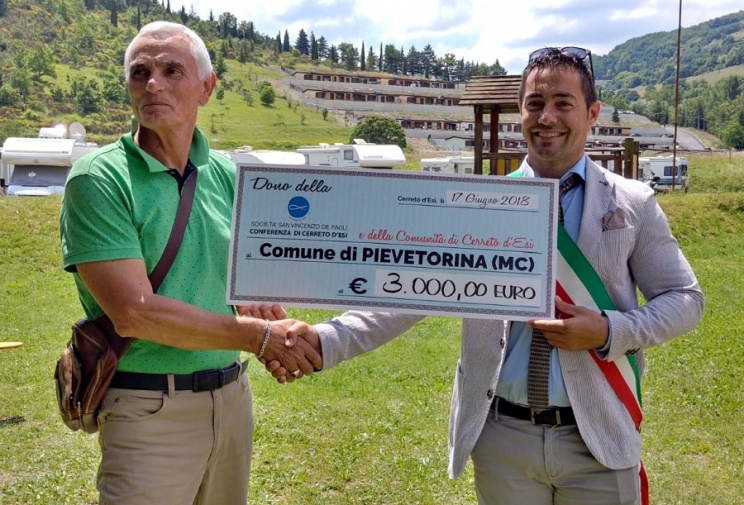Dalla Conferenza di Cerreto d’Esi della San Vincenzo de’ Paoli una donazione di 3000 euro per la scuola materna di Pieve Torina. La consegna della somma, raccolta in occasione del 70esimo anno di fondazione della società, è avvenuta domenica scorsa, durante la ricca giornata di manifestazioni che si sono svolte nel paese distrutto dal terremoto, allietato dalla parata della banda locale e dei corpi bandistici di Petriolo e Terre Roveresche. Qui, il presidente della Conferenza, Luciano Mari, ha voluto simbolicamente festeggiare il settantesimo anno della fondazione della società assieme a 39 tra soci e simpatizzanti che hanno raggiunto in pullman Pieve Torina per partecipare all'intera giornata. A tutti i donati è andata la grande riconoscenza del sindaco, Alessandro Gentilucci, per il gesto di generosità rivolto ai più piccoli e alla costruzione della nuova scuola materna. Presenti anche i presidenti delle Conferenze della San Vincenzo de’ Paoli di Cupramontana, Giovanni Ricciotti, di Fabriano, Enzo Corrieri, di Matelica, Pierina Martinelli, nonché del presidente vincenziano regionale, Maria Teresa Spuri Cirilli e del direttore della Caritas parrocchiale di Cerreto d’Esi, Enrico Biondi. Sono arrivati, durante il momento conviviale offerto dai vincenziani, i saluti di Francesco Mearelli, presidente del Consiglio Centrale della San Vincenzo della Città della Carta.