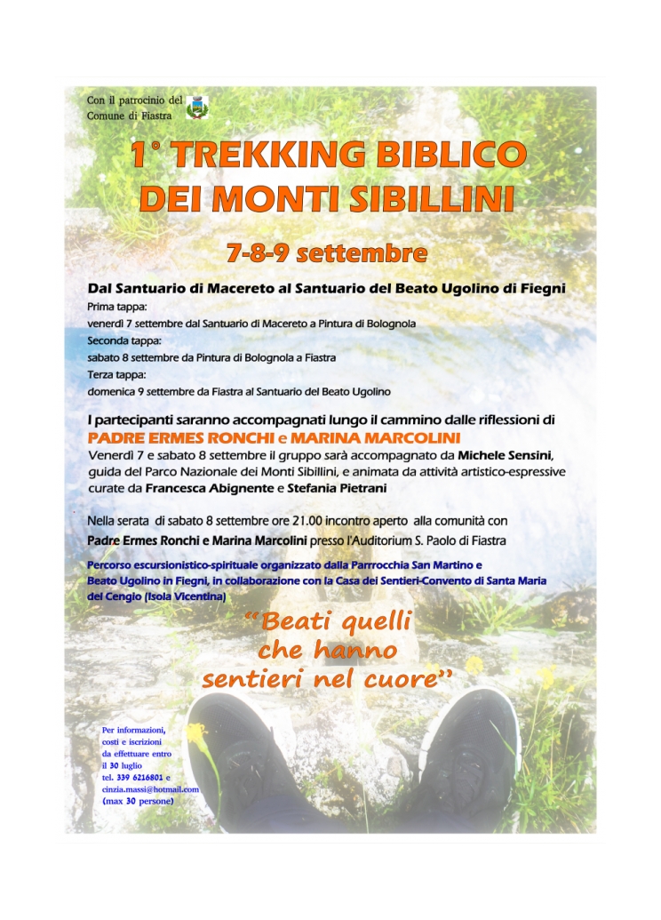 La parrocchia di San Martino e Beato Ugolino in Fiegni di Fiastra, in collaborazione con l’associazione La Casa dei Sentieri - Convento di Santa Maria del Cengio di Isola Vicentina e con il Patrocinio del Comune di Fiastra, propone un cammino di tre giorni, a piedi, in gruppo, a contatto con la natura, scandito da momenti di riflessione, spazi di silenzio e di incontro.