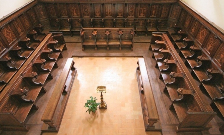 Nell'ambito delle manifestazioni inerenti la Corsa alla Spada e Palio si è svolto presso la nuova chiesa del monastero di Santa Chiara un incontro dal titolo“In guerra senza armi. La battaglia spirituale di sora Baptista negli stalli del coro delle clarisse di Camerino”. L'incontro, organizzato dall'associazione "Amore per Amore", in collaborazione con il prof. Capriotti e le Clarisse di Camerino fa parte di una serie di incontri che l'associazione sta organizzando "Sulle Tracce di Santa Camilla Battista Varano" e ha visto la presenza dello stesso professor Giuseppe Capriotti, esperto sulla figura di Santa Camilla Battista Varano. Un’ottima occasione per riflettere su questa personalità mistica che ha contraddistinto la santa più venerata dai camerinesi. Il professore ha trattato della “guerra” vissuta in prima persona da Suor Battista, in modo particolare quando il Borgia espugnò Camerino nel 1502, ma anche quale metafora, intesa come una consuetudine medievale, per marcare la “battaglia spirituale” che affliggeva la santa, considerata già tale durante la sua vita, perciò motivo d’orgoglio per il padre Giulio Cesare da Varano. Le monache avevano la visione che per arrivare in paradiso occorre percorrere una scala combattendo a ogni scalino contro il peccato, tematica presente in molti trattati, come “Le sette armi spirituali” di Caterina da Bologna, un’altra santa “viva” che Camilla conosceva. Riferimento al coro presente nel monastero camerte, realizzato da Domenico Indivini da San Severino, considerato dal relatore un’allegoria quale una guida del percorso che una suora deve compiere. Il coro è lo spazio dedicato alla preghiera e quello camerinese mostra nello stallo lo stemma dei Varano, testimonianza dell’influenza di Santa Camilla sulla sua famiglia per la realizzazione, con la forma a unico emiciclo, probabilmente per via della sua originaria posizione differente da quella attuale: si trovava in origine, secondo il docente, sopra l’ingresso della chiesa in posizione pensile e senza l’appoggio alla parete, prima del devastante terremoto del 1799. L’indizio di tale ipotesi viene da alcuni stalli presenti nel coro, luogo paradisiaco che presenta motivi floreali in maniera evidente nel seggio in mezzo riservato alla badessa, segnante i posti organizzati seguendo una gerarchia specifica ed essenziale per vivere nel monastero.Un altro stallo figura una fonte con dei serpenti che escono da questa, simbolo di liberazione dal male. Dunque ogni raffigurazionenegli stalli è essenziale sicché consente di percepire ogni tappa di questo cammino dell’anima verso la salvezza.
