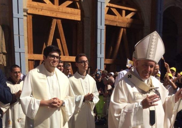 Dopo aver deposto una corona di fiori, il Santo Padre ha incontrato i sindaci del cratere e, messi i paramenti, ha preso parte al corteo verso il palco dove viene celebrata la messa.