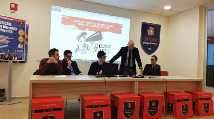 Nell’aula conferenze del Rettorato sono intervenuti il sindaco Sandro Sborgia il Pro Rettore Luciano Barboni e il rappresentante degli studenti Unicam Riccardo Cellocco, il legale rappresentante degli esercizi commerciali Jacopo Maria Casaroli e il Consigliere comunale alle politiche giovanili Riccardo Pennesi.