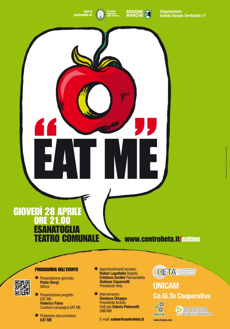 Al Teatro comunale di Esanatoglia il prossimo giovedì 28 aprile verrà presentato il progetto “Eat me”dedicato alla complessa tematica dei disturbi alimentari. Enti patrocinatori sono il Consiglio Regionale delle Marche e la Regione Marche. L''organizzazione dell'evento si deve all' Ambito Sociale Territoriale 17che ha deciso di appoggiare il progetto portato avanti da anni dal Centro Heta di Ancona e il cui obiettivo è aiutare i giovani e le famiglie a riconoscere e comprendere i sintomi del disturbo alimentare, permettere di fare una diagnosi precoce e a capire come affrontare la malattia, senza dimenticare che dietro a queste problematiche ci sono delle persone con le proprie fragilità e con la propria sensibilità..