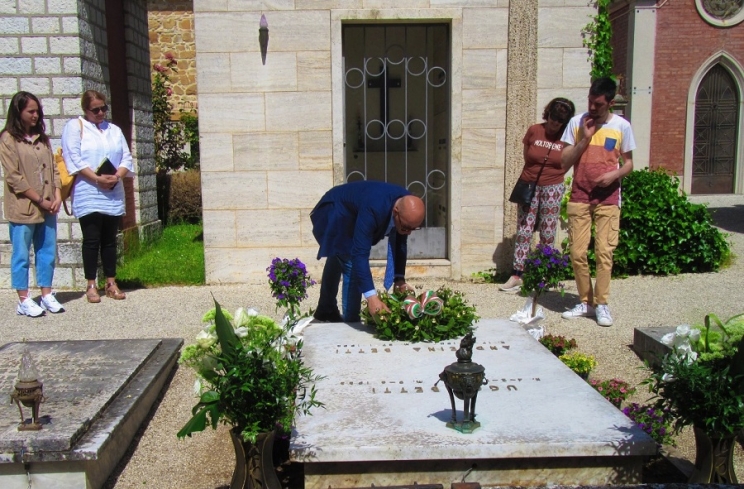 Un semplice gesto, ma sentito, quello del sindaco Sandro Sborgia che questa mattina, con una composta cerimonia, ha ricordato il poeta e drammaturgo deponendo una corona sulla sua tomba al cimitero di Camerino.